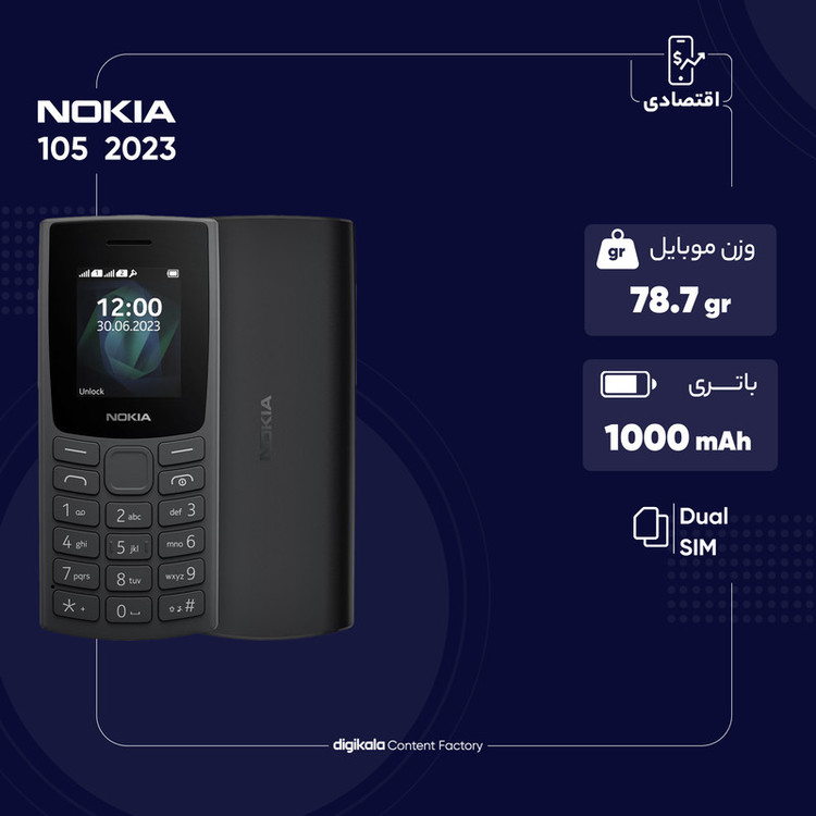 اگر به دنبال خرید گوشی هستید که برای استفاده روزمره عملکرد قابل قبولی داشته باشد، قطعا گوشیهای کلاسیک میتوانند گزینه بسیار مناسبی را در اختیارتان قرار دهند. نوکیا هم در این زمینه عملکرد بسیار خوبی را بهنمایش گذاشته و مدل 105 2023 یکی از این محصولات باکیفیت است. این گوشی به صفحهنمایش 1.8 اینچ با رزولوشن 120×160 پیکسل رنگی مجهز شده است که پر نمایش آیکونها و اعلانها، وضوح تصویر خوب و قابل قبولی دارد. خبری از سنسور دوربین سلفی و دوربین اصلی برای این گوشی نیست که اتفاق کاملا طبیعی است. به نسبت مدل 2022 این گوشی از طراحی متفاوت و البته کاربرپسندتری بهره برده و دکمههای صفحهکلید هم زیر صفحهنمایش قرار گرفتهاند و ابعاد مناسب و متریال باکیفیت در نظر گرفته شده برای دکمههای صفحهکلید، امکان استفاده راحت و سریع را برای شما فراهم کرده است. بهره بردن از باتری با میزان ظرفیت 1000 میلیآمپرساعت سبب شده تا نوکیا 105 2023 همانند اکثر گوشیهای کلاسیک این شرکت، به ازای هر بار شارژ صد درصدی، توانایی ارائه زمان آماده بهکار بالایی را داشته باشد و با یک بار شارژ، تا چند روز نیاز به شارژ دوباره نداشته باشید. در مجموع اگر به دنبال خرید گوشی کلاسیک با قیمتی ارزان هستید که در اجرای فعالیتهای روزمره عملکرد خوبی داشته باشد، نوکیا 105 2023 میتواند گزینه بسیار مناسبی باشد. لازم به ذکر است که این گوشی موبایل در ایران و تحت لیسانس برند اصلی نوکیا مونتاژ شده است.