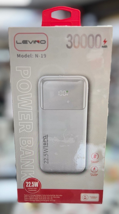 - حضور نمایشگر دیجیتال در پاور بانک LEVINO 30000mAh مدل n19 به کاربر امکان مشاهده دقیق وضعیت شارژ و وضعیت باطری را میدهد.