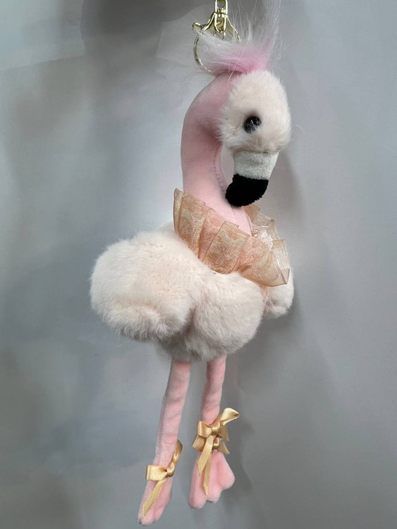 این فلامینگوی بامزه با رنگ صورتی ملایم، پرهای نرم و پاپیونهای طلایی روی پاهاش، یه انتخاب شیک و دخترونهست که به هر کیفی جلوهی خاصی میده.