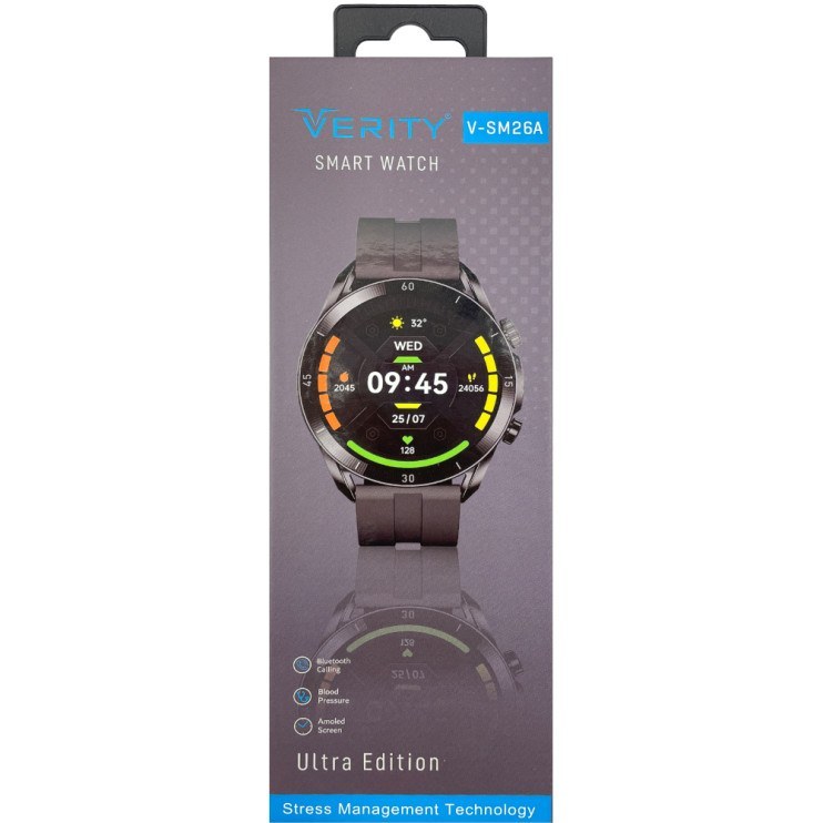 ساعت جدید وریتی مدل V-sm26A که شامل امکانات کنترل موسیقی (Music Player) ، کنترل سطح اکسیژن خون ، کنترل سطح فشار خون ، قابلیت مکالمه از طریق بلوتوث ، شمارنده ضربان قلب ، گام شمار است